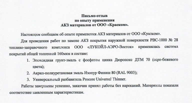 Письмо-отзыв по итогам применения АКЗ материалов на объекте Лукойл